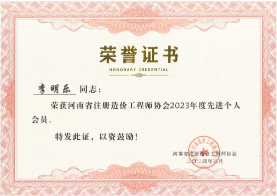 在職業(yè)生涯中,令我倍感驕傲的是榮獲了河南省注冊造價工程師協(xié)會2023年度先進(jìn)個人會員的稱號。這一榮譽不僅是對我過去一年辛勤工作的肯定,更是對我專業(yè)能力和職業(yè)精神的認(rèn)可。這份榮譽激勵我不斷前進(jìn),繼續(xù)在職業(yè)生涯中追求卓越,為行業(yè)的發(fā)展貢獻(xiàn)自己的力量。